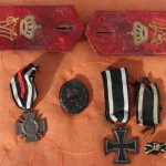 Darunter das Ehrenkreuz für Frontkämpfer von 1935, das Verwundetenabzeichen in Schwarz und das Eiserne Kreuz zweiter Klasse mit der Miniatur fürs Knopfloch.