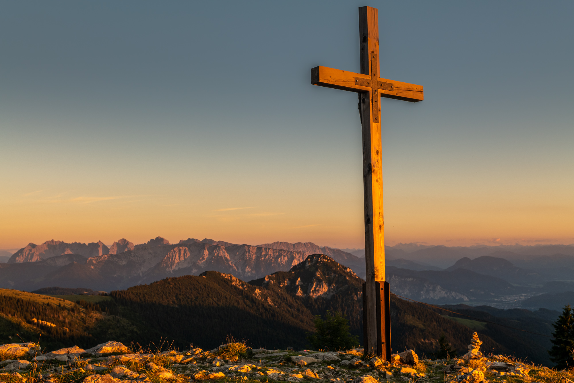Das Gipfelkreuz im Abendlicht mit Blick auf das Kaisergebirge
