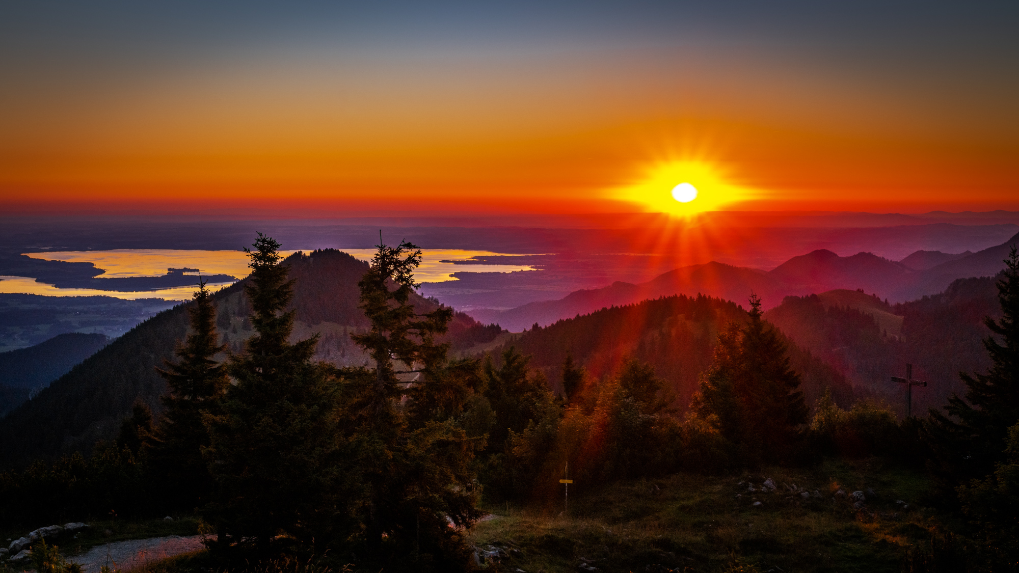 Blick von der Hochries über den Riesenberg zum Chiemsee bei Sonnenaufgang