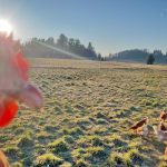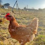 “Übrigens, unterscheiden sich die Bio- und Freilandhaltung in der Größe der Auslauffläche nicht voneinander. Gerne bieten wir unseren Hühnern sogar mehr Auslauf als gesetzlich vorgeschrieben. Zum Schutz vor Greifvögeln bieten wir unseren Hühnern Unterstände und pflanzen immer wieder Streuobstbäume und Weiden. Dennoch erwischt der Habicht regelmäßig Beute – so wie auch heute wieder (wie an den Federmengen zu erkennen ist). Das ist halt die Natur. Die Unterstände nutzen die Hühner auch gerne um darunter im Sand zu baden – das ist sehr wichtig für die Gefiederpflege.” erklärt uns Landwirtin Maria Riepertinger weiter.
