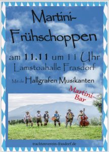 Am Sonntag, den 11. November, findet ab 11 Uhr der alljährliche Martini-Frühschoppen in der Lamstoahalle statt. Die Hallgrafen Musikanten spielen zum Tanz und sorgen für gute Stimmung. An der Bar der Aktiven können ab dem frühen Nachmittag verschiedene Martini-Mischungen genossen werden.