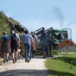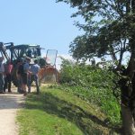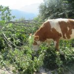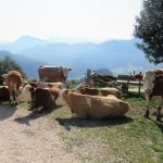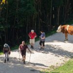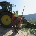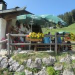 Kurz vor der Alm gibt es noch einen Stau: Baumfällarbeiten. Macht aber nichts, denn es ist ganz interessant zu sehen, wie ein mächtiger Baum umgesägt und abtransportiert wird. Nachdem der Weg wieder frei ist, sind wir gleich bei der Alm und haben auch Glück, daß wir einen freien Tisch bekommen. Es gibt nur almübliche Brotzeiten. Speckbrot und Käse schmecken aber ausgezeichnet und den Käse gibt es sogar “ToGo”, was wir auch machen.