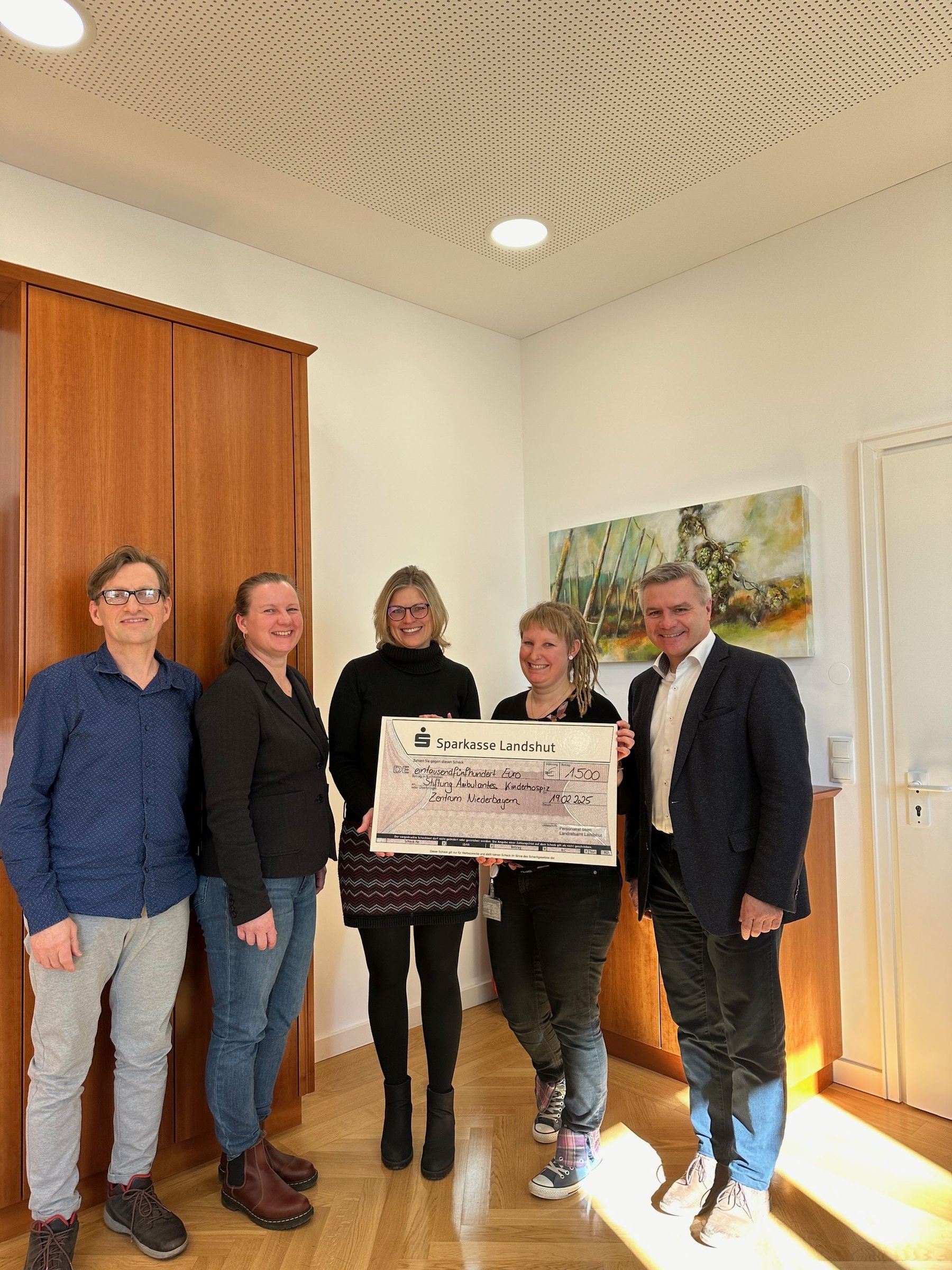 Vertreterinnen und Vertreter des Personalrates des Landratsamtes Landshut übergaben mit Landrat Peter Dreier einen Spendenscheck an Petra Finkenbeiner (Mitte) vom Ambulanten Kinderhospiz, Standort Landshut.