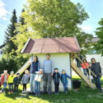 Foto 1. Kindergarten St. Irmengard mit neuem Spielturm – 2. Kindergarten St. Irmengard mit Spender Markus und Christine Stocker (Mitte) und mit Birgit Krumrey von der Kindergarten-Leitung (re.)