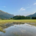 Nach dem Starkregen am Donnerstagnachmittag gab es anschließend ein malerisches Spiegelbild in der Wasserpfütze in der Wiese unterhalb von Schloss Hohenaschau.