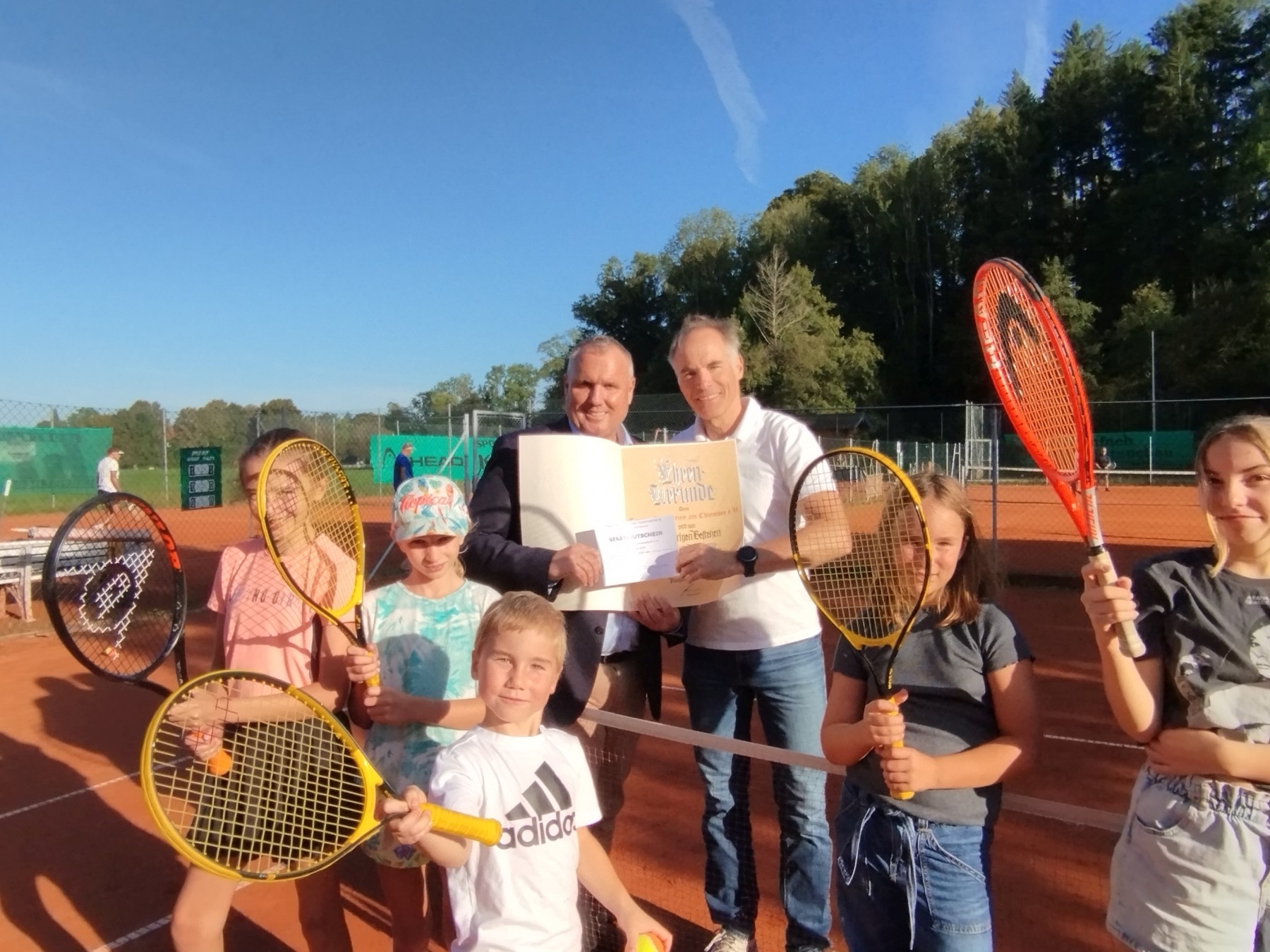 von links: Bezirksvorstand Beisitzer Rainer Pastätter (BLSV), 1. Vorstand Helge Luesebrink (TC Prien) vorne TC Prien Tenniskinder