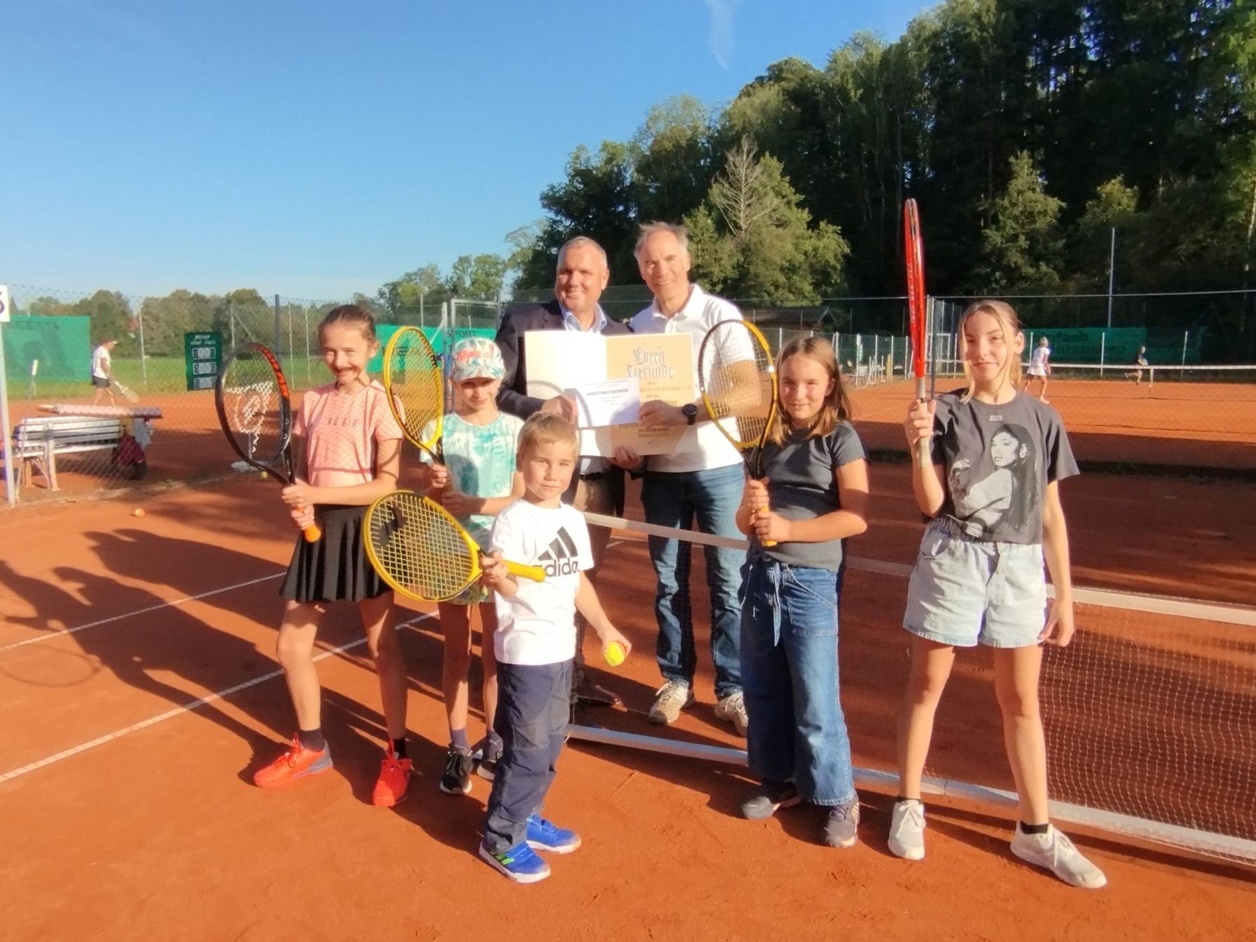 von links: Bezirksvorstand Beisitzer Rainer Pastätter (BLSV), 1. Vorstand Helge Luesebrink (TC Prien) vorne TC Prien Tenniskinder