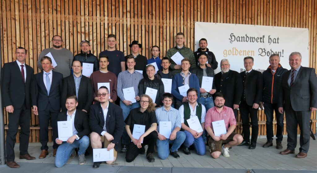 Außerdem erwarben 2 Schüler durch die besuchte „BS+“-Klasse die Fachhochschulreife. Studiendirektor Stefan Olbert hieß neben den Absolventen und Lehrkräften u. a. auch Innungs-Obermeister Christian Albersinger (Metall) und den Prüfungs-Vorsitzenden Josef Gantner (SHK) sowie Vertreter der Ausbildungsfirmen willkommen. „Mit dem heutigen Abschluss habt ihr den Grundstein für eure Zukunft gelegt“ rief er den Schülern zu, riet ihnen aber, diese sorgsam zu planen und zu gestalten. „Sie haben wirklich Großartiges geleistet, eine Berufsausbildung ist kein Zuckerschlecken“ lobte Landrat Otto Lederer und führte weiter aus: „Sie haben mit dem Abschluss auch bewiesen, dass Sie etwas zu Ende bringen können, dass Sie Durchhaltevermögen und Biss haben und dass man sich auf Sie verlassen kann“. Seine Rede beschloss er mit dem Zitat von Victor Hugo: „Die Zukunft hat viele Namen. Für die Schwachen ist sie die Unerreichbare, für die Furchtsamen ist sie die Unbekannte, für die Tapferen ist sie die Chance“ und ergänzte: „Ich bin absolut davon überzeugt, dass Sie ihre Chance nutzen“. Bezirksrat Sebastian Friesinger hob eingangs seiner Ansprache den „Profil Inklusion“-Status der Schule hervor und wies auf ihre „sehr gute technische, aber auch menschliche Ausstattung“ hin. Außerdem unterstrich er die Bedeutung der Inklusion: „Der gemeinsame Unterricht mit Menschen mit und ohne Handicap ist wertvoll, ein Miteinander ist das Wichtigste“. Abschließend brach eine kräftige Lanze für das Handwerk: „Es gibt Leute, die viel wissen und es gibt Leute, die man braucht. Ihr seid die Leute, die man braucht“. Mit einem viel beklatschten Video blickte Oberstudienrat Markus Harbeck auf die Schulzeit zurück – mit heiteren, vorder-, hinter- und tiefgründigen Schüleraussagen. Er wünschte seinen Schützlingen für die Zukunft „stets die richtigen Menschen an ihrer Seite“. Oberstudiendirektor Jürgen Ersing ging auf den „schlechten Ruf“ der Jugend ein, der sich von Sokrates bis zur „Generation Z“ erstrecke. „Ich habe ein ganz anderes Bild von ihr: Sie ist unsere Chance und unsere Zukunft“ konstatierte der Schulleiter und fügte hinzu: „Ihr habt große und nachhaltige Ziele“. Die anschließende Ehrung (mit einer finanziellen Zuwendung des Landkreises) für die 19 Notenbesten nahmen Landrat Otto Lederer und Jürgen Ersing vor. Geehrt wurden (Notendurchschnitt und Ausbildungsbetrieb in Klammern):