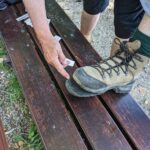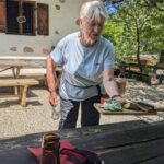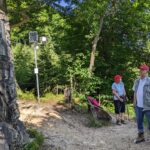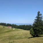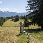 Wir folgen dem Wegweiser in Richtung Zeppelinhöhe, Rachlalm, Hochplatte. Rachlalm geöffnet steht darunter. In nicht einmal einer halben Stunde sind wir beim Denkmal vom Ferdinand Graf vonZeppelin auf der Zeppelinhöhe, die einen schönen Ausblick ins Achental und in die Chiemgauer Alpen parat hält. Warum ausgerechnet in Grassau ein Denkmal für den Luftschiff-Pionier steht, ist auf dem Gedenkstein nicht angeführt und kümmert uns auch nicht weiter, denn wir haben eine anderes Problem: am Schuh von Christoph löst sich die Sohle. Wir haben weder Kleber noch Schnüre, aber Gisela hat Pflaster dabei. Mit der verpflasterten Schuhspitze versuchen wir bis zur Rachlalm zu kommen, denn es ist nicht weit bis dorthin. Es geht einigermaßen gut bis wir auf die Almstraße zur Rachlalm kommen. Hier sitzt eine nette Dame vor einem Sperrgitter und läßt niemanden durch. Es ist die Chefin vom Großrachlhof zu der die Rachlalm gehört und sie erklärt uns, dass wegen Baggerarbeiten alle Zugänge von dieser Seite zur Rachlalm gesperrt sind – es besteht Lebensgefahr, da sich immer wieder große Felsbrocken lösen und herunterkugeln.