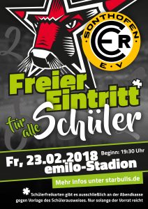 Am kommenden Freitag ist nicht nur das Heimspiel der Starbulls Rosenheim gegen den ERC Sonthofen. An diesem Tag werden an den Schulen in der Region auch die alljährlichen Zwischenzeugnisse vergeben. Anlässlich der Ausgabe der Halbjahreszeugnisse haben sich die Starbulls Rosenheim etwas einfallen lassen, um alle Fans und Interessierte im Schüleralter zu belohnen. Für das Heimspiel gegen den ERC Sonthofen erhalten alle Schüler gegen Vorlage des Schülerausweises freien Eintritt. Die Freikarten sind ausschließlich an der Abendkasse vor dem Heimspiel erhältlich. Diese öffnet zwei Stunden vor Spielbeginn. Tickets nur solange der Vorrat reicht.
