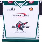Auf ein durchweg traditionelles Outfit setzen die Starbulls in der neuen Saison bei den Auftritten in fremden Stadien. Klassisch in Weiß gehalten, ist bei den Auswärtstrikots natürlich das traditionelle Rautenmuster im Hüftbereich ebenfalls wiederzufinden. Im Gegensatz zum neuen Heimtrikot sind die farblichen Akzente bei der Auswärtsvariante aber im klassischen „Starbulls-Grün“ gesetzt.