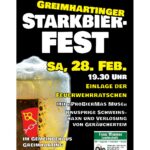 Die Freiwillige Feuer Greimharting veranstaltet am Samstag, 28. Februar wieder ihr alljährliches Starkbierfest im Gemeindehaus Greimharting. Beginn der Veranstaltung ist um 19:30 Uhr.