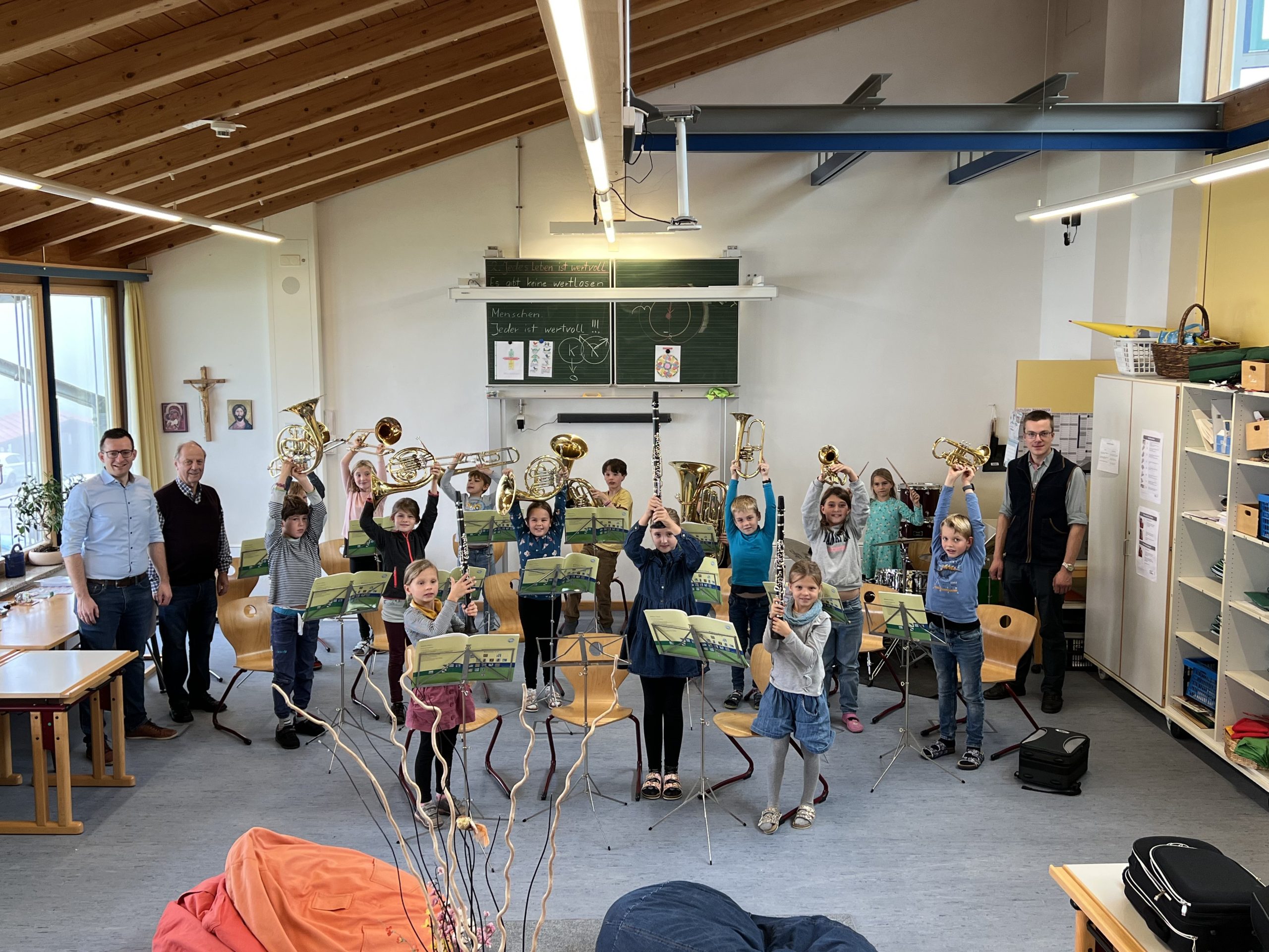 Bläserklasse Samerberg, Sebastian Denzler (Musikkapelle), Sepp Hieber (Musikförderverein), Joseph Schillinger (Bläserklassenleiter)