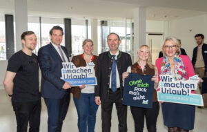 „Wir machen Urlaub“: Unter diesem Motto hat die bayerische Tourismusbranche eine Kampagne gestartet, die aufzeigt, dass Tourismus nicht nur ein enorm wichtiger Wirtschaftsfaktor und ein Garant für hohe Lebensqualität ist, sondern auch ein äußert attraktiver Arbeitgeber. Mit dabei (v. l.): Stefan Gebert vom Romantik Hotel Hirschen in Parsberg, DEHOGA Bayern-Landesgeschäftsführer Dr. Thomas Geppert, Magdalena Sturm vom Hotel Oberstdorf in Oberstdorf, Bayerns Wirtschaftsminister Hubert Aiwanger, Laura Faltner, ebenfalls vom Hotel Oberstdorf, sowie Susanne Droux, Geschäftsführerin für Berufsbildung und Fachkräftesicherung im DEHOGA Bayern.