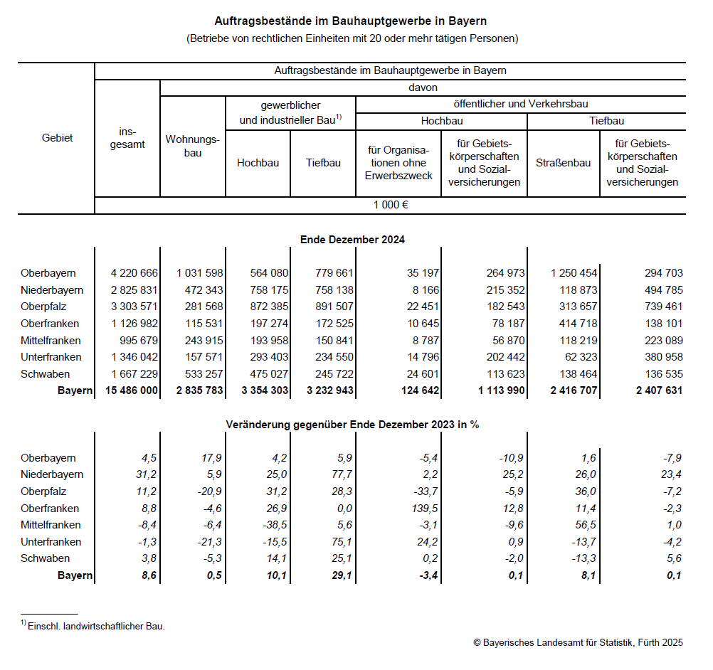 Ende Dezember 2024 liegt der Auftragsbestand im bayerischen Bauhauptgewerbe bei einem Gesamtwert von 15,49 Milliarden Euro. Das entspricht einer Steigerung um 1,23 Milliarden Euro beziehungsweise 8,6 Prozent gegenüber dem Wert des Vorjahres. Nach weiteren Angaben der Fachgruppe im Bayerischen Landesamt für Statistik werden insbesondere für den gewerblichen und industriellen Bau wertmäßig höhere Auftragsbestände als vor Jahresfrist festgestellt.