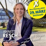 Sollten Sie Schwierigkeiten haben, sich mit Nahrungsmitteln oder Medikamenten zu versorgen, können Sie gerne Kontakt mit mir unter 015150683535 oder annette.resch@gmx.de Kontakt aufnehmen. Gemeinsam mit meinem Team werde ich Sie gerne unterstützen. Dieses Angebot gilt selbstverständlich auch nach der Stichwahl! Auch und gerade in dieser besonders herausfordernden Situation würde ich mich über Ihre Stimme für unseren Landratskandidaten Otto Lederer und mich persönlich sehr freuen!