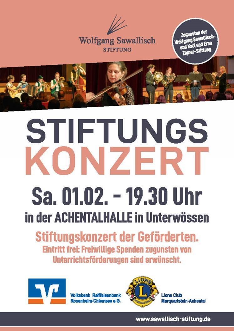 Ein Stiftungskonzert mit jungen Nachwuchsmusikanten zugunsten der Wolfgang-Sawallisch- und Karl und Erna Eigner-Stiftung findet am Samstag, den 1. Februar 2020, um 19.30 Uhr in der Achentalhalle in Unterwössen statt. Der Eintritt ist frei, Spenden zugunsten von Unterrichtsförderungen sind erwünscht.