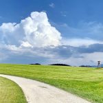 Eine im Hintergrund ganz klein erscheinende Kampenwand, ein im Horizont-Blick auftauchender Jägerstand sowie ein weiß-blaues Gewölkengebilde sind Beiwerk beim Anblick frisch gemähter Felder im Chiemgau nach der erfolgreichen Siloernte der Landwirte, die in kurzer Zeit kräftig Hand anlegen mussten, um die Ernte einzufahren.
