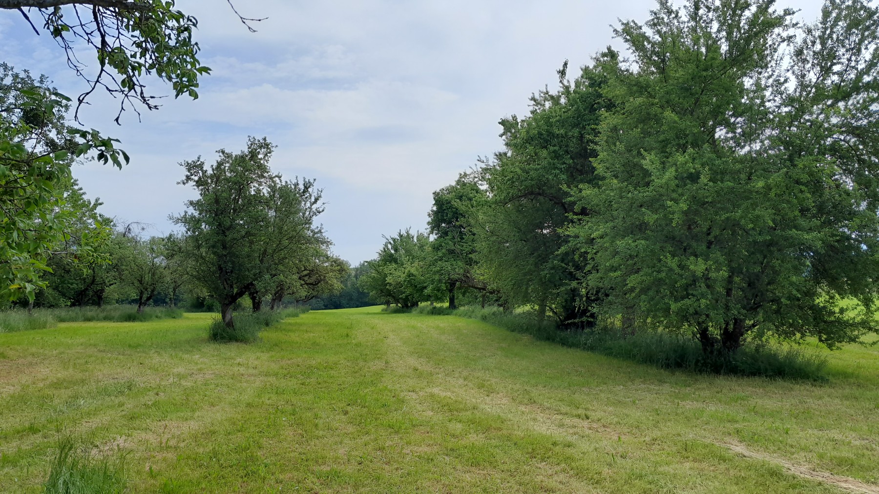 Streuobstwiese, die in moderne landwirtschaftliche Nutzung mit Großmaschinen integriert wurde. Reihenabstand 13 m.