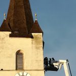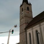 Aktuell begutachtet der Fachstatiker den Kirchturm in Halfing. Hier sehen Sie den Kirchturm. Im oberen Drittel sehen Sie einen leichten Knick nach rechts. Dieser Knick und der komplette Kirchturm werden nun von dem Fachstatiker begutachtet.