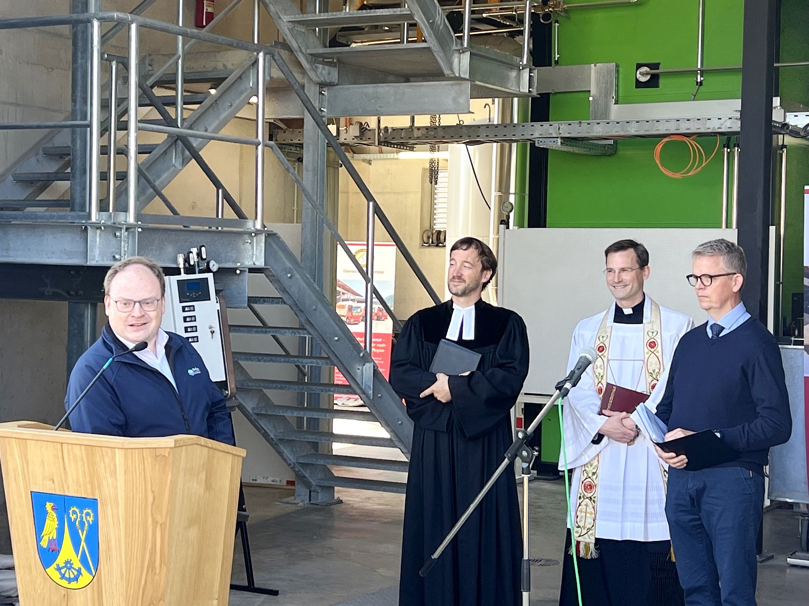 Feierliche Eröffnung und Segnung von links: Bürgermeister Andreas Friedrich mit Mirko Hoppe (Evangelisch-Lutherische Kirche), Pfarrer Philipp Werner von der Katholischen Pfarrgemeinde und Torsten Böhme von der Neuapostolischen Kirchengemeinde.