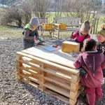 Die Kinder haben Spaß am „werkeln“ , welches ein gutes Mittel gegen die kalten Temperaturen ist. Bei jedem Wetter findet unser Morgenkreis und auch die Brotzeit draußen statt. Bewegung wie Schlitten fahren, laufen, hüpfen und Spaziergänge machen unseren Alltag abwechslungsreich.