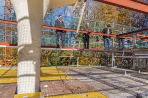 Einen faszinierenden Blick auf die Baustelle konnten Johannes Weber (zweiter Bürgermeister von Unterwössen, erster von links), Bezirkstagspräsident Josef Mederer (zweiter von links) und Frank Bauer (erster von rechts) auf dem umlaufenden Gerüst erhaschen. Der Bauleiter des Freilichtmuseums Glentleiten, Martin Wiedenbauer (zweiter von rechts), gab dazu Erklärungen über die noch notwendigen und bereits abgeschlossenen Arbeiten. Bildquelle: Bezirk Oberbayern, Archiv FLM Glentleiten, Foto: Bäck