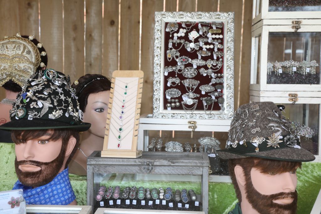 Der anwesende Schuhmacher Simon aus Schwindkirchen findet für jeden den passenden Trachtenschuh. Traditionsbewusste Trachtenträger wissen außerdem, dass ein Hut zur Tracht nicht fehlen darf. Hüte in allen Formen und Größen sind durch den Hutmacher vertreten. Faszinierend ist auch das alte und filigrane Handwerk der Federkiel- und Goldstickerei, das man heutzutage kaum noch zu sehen bekommt. Zur Lederhose gehört auch die handgefertigten und reichlich verzierten Hosenträger. Es waren verschiedene Dirndl- und Lederhosenschneider, Hischhornschnitzer und Hornmaler, eine Goldschmiedin, Gold- und Federkielsticker, Haferlschumacher, Kinderdindln- und Lederhos’n, Korbfläuchter boten Volkstanzkörberl aber auch Einkaufskörbe an, Dindltaschen aus Fils und edlem Leder gefertigt waren ebenso vertreten wie Hofladen-Dirndlstoffe, Krüllarbeiten sowie zahlreiche Klosterarbeiten in Gold und Silber, Loferl und Trachtenstrümpfe, Wollstoffe, Tücher, Kropfbänder Haarsteck- und Kopfschmucknadeln, Glasperlen- und hochwertiger Goldschmuck oder Antikschmuck in reichhaltigen Angeboten zu sehen. Die Aussteller kamen aus dem Allgäu, Chiemgau, Bad Tölz, vom boarischen Oberland und vom benachbarten Österreich.. Auch musikalisch war auf dem Trachtenmarkt einiges geboten. Ausstellerbereich im Freien unterhält die weithin bekannte Familie Ernst aus Schwindkirchen mit flotten Instrumentalstückln und mit volkstümlichen Gesang. Die Mitglieder des Trachtenvereins d’Vilstaler aus Gebensbach führten am Sonntag in ihrer Miesbacher Tracht traditionelle Volkstänze und Schuablattln vor. Es waren verschiedene Hutmacher, Hischhornschnitzer und Hornmaler, eine Goldschmiedin, Gold- und Federkielsticker, Haferlschumacher, Kinderdindln- und Lederhos’nschneider ebenso vertreten wie Hofladen-Dirndlstoffe, Krüllarbeiten sowie zahlreiche Klosterarbeiten in Gold und Silber, Loferl und Trachtenstrümpfe, Wollstoffe, Tücher, Kropfbänder Haarsteck- und Kopfschmucknadeln, Glasperlen- und hochwertiger Goldschmuck oder Antikschmuck in reichhaltigen Angeboten zu sehen.