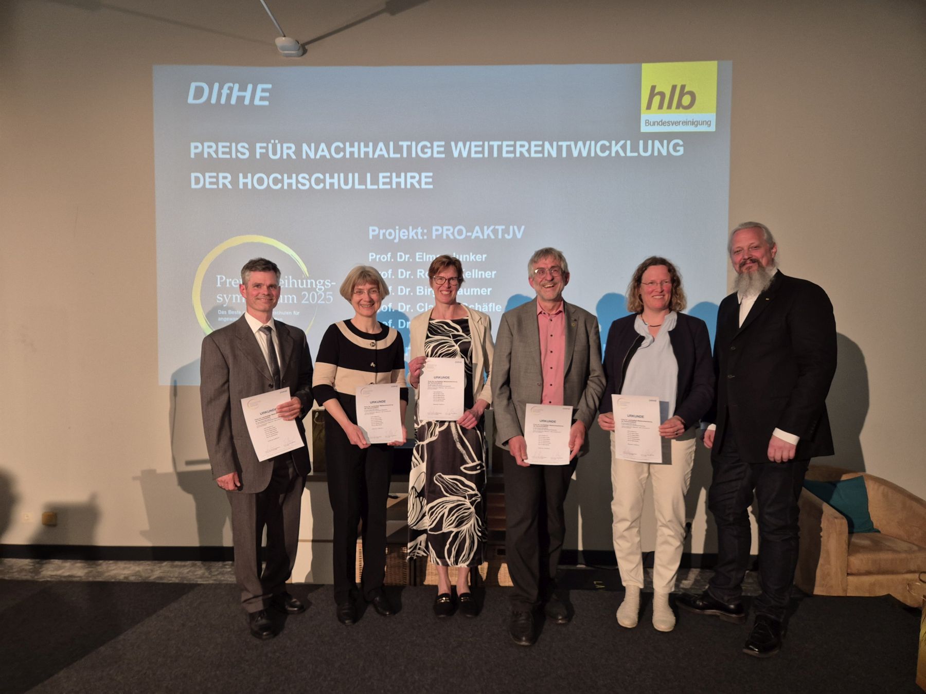 Das Team von „PRO-Aktjv“ bestehend aus Robert Kellner, Silke Stanzel, Birgit Naumer, Elmar Junker und Claudia Schäfle (von links) zusammen mit dem Laudator und Vizepräsidenten des Hochschullehrerbundes Jörn Schlingensiepen bei der Preisübergabe in Berlin. Bild: Nadja Held