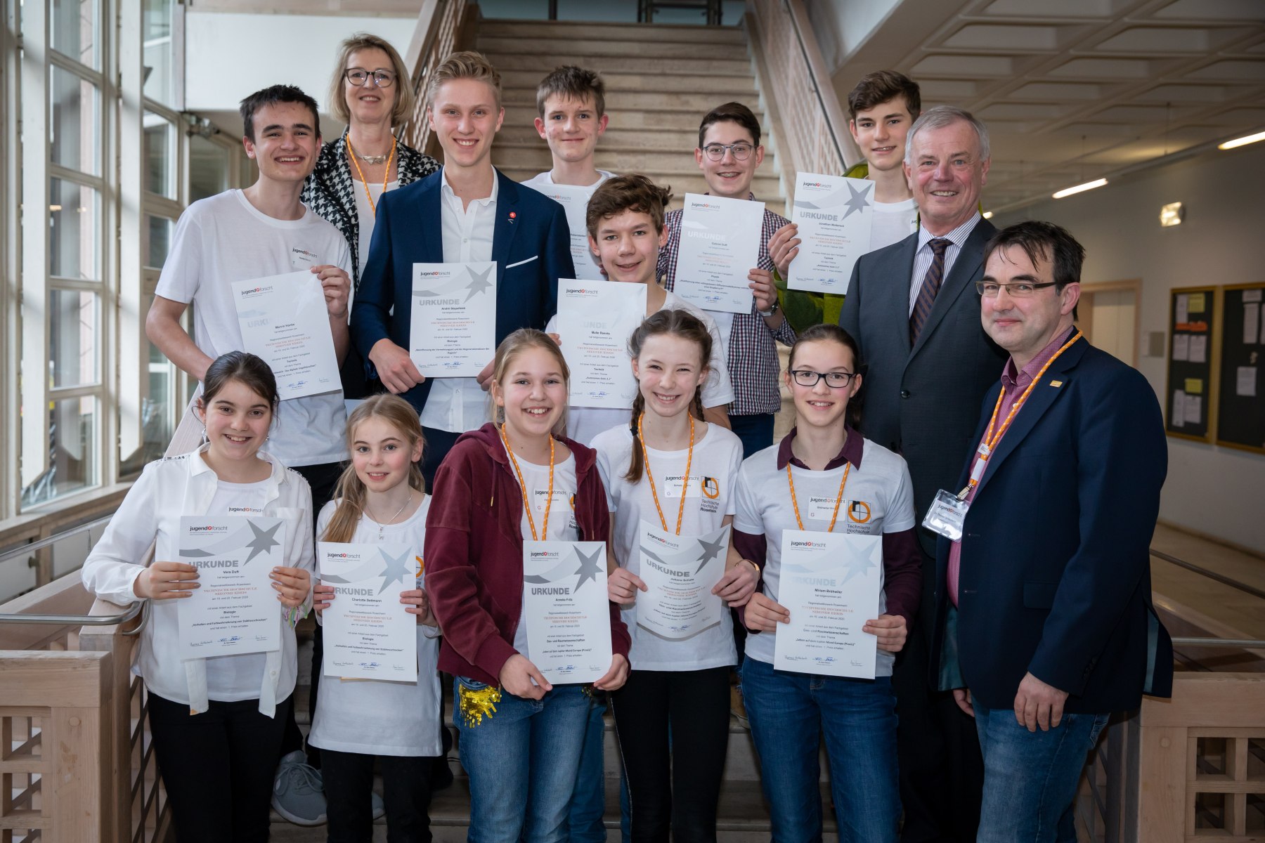 Die Ersten Plätze (von links: Marvin Hanke, Bettina Oestreich Geschäftsführerin Seeoner Kreis, Stapfelfeld André, Korbinian Haberstetter, Malte Reents, Gabriel Duft, Jonathan Woltereck, Franz Winterer Vorsitzender Seeoner Kreis, Duft Vera, Dettmann Charlotte, Fritz Anneke, Schatz Juliana, Brühwiler Miriam, Thomas Grillenbeck Wettbewerbsleiter Jugend forscht) © Max Baudrexl