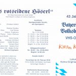 Seit 43 Jahren gibt es eine Bayerische Volksbühne der Volkshochschule im Osten des Landkreises München in Aschheim unter der Leitung von Helmut Englmann aus Olching. Die Aufführungen in der Sportgaststätte Tassilo sind seit Jahren überaus gut besucht, da das Theaterteam unter der Regie & Leitung von Helmut Englmann für Kurzweil und Lacherfolge garantiert. Die heurigen Frühjahrs-Aufführungen mit dem Bauernschwank von Josef Zeitler “Das rotseidene Höserl” mit “Bearbeitung ins Bayerische” durch Helmut Englmann wird noch bis Ende April mehrfach gespielt, unter anderem auch am Sonntag, 22. April als Mittagsschmankerl. Telefonische Reservierungen sind montags bis mittwochs von 13 Uhr bis 18 Uhr bei Sonja Schöne, Tel. 089-9045328 möglich.