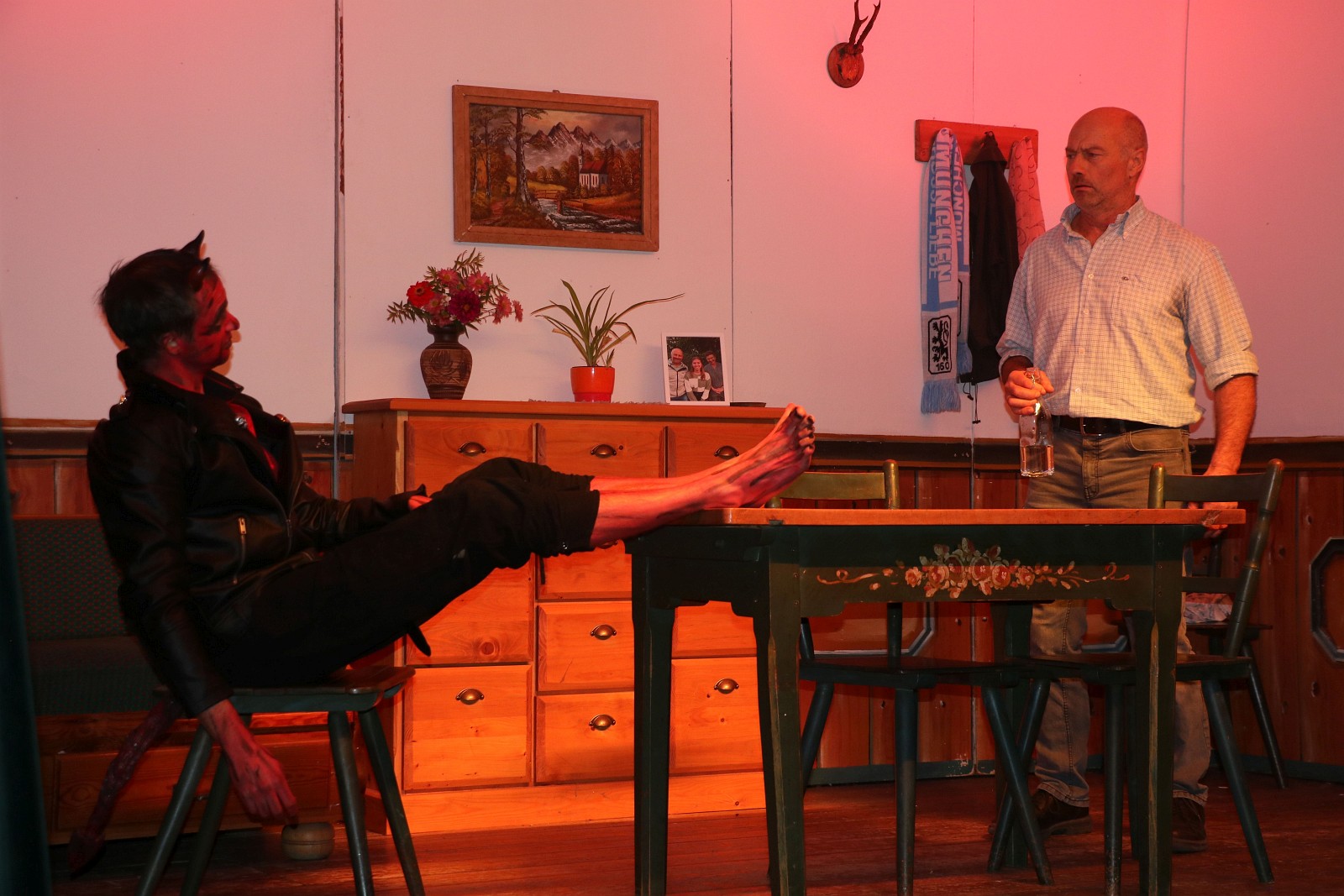 Der Beelzebub (Thomas Freund); als Abgesandter von unten, macht er dem Sepp (Georg Aicher) viele Angebote, die man eigentlich nicht ablehnen kann; ein Leben in Saus und Braus und mit flotten, gut bestückten Frauen, wenn er sich ihm anvertraue. Der Haken dabei ist lediglich, dass zum Schluss die Seele des Verblichenen in die Hölle kommen wird.
