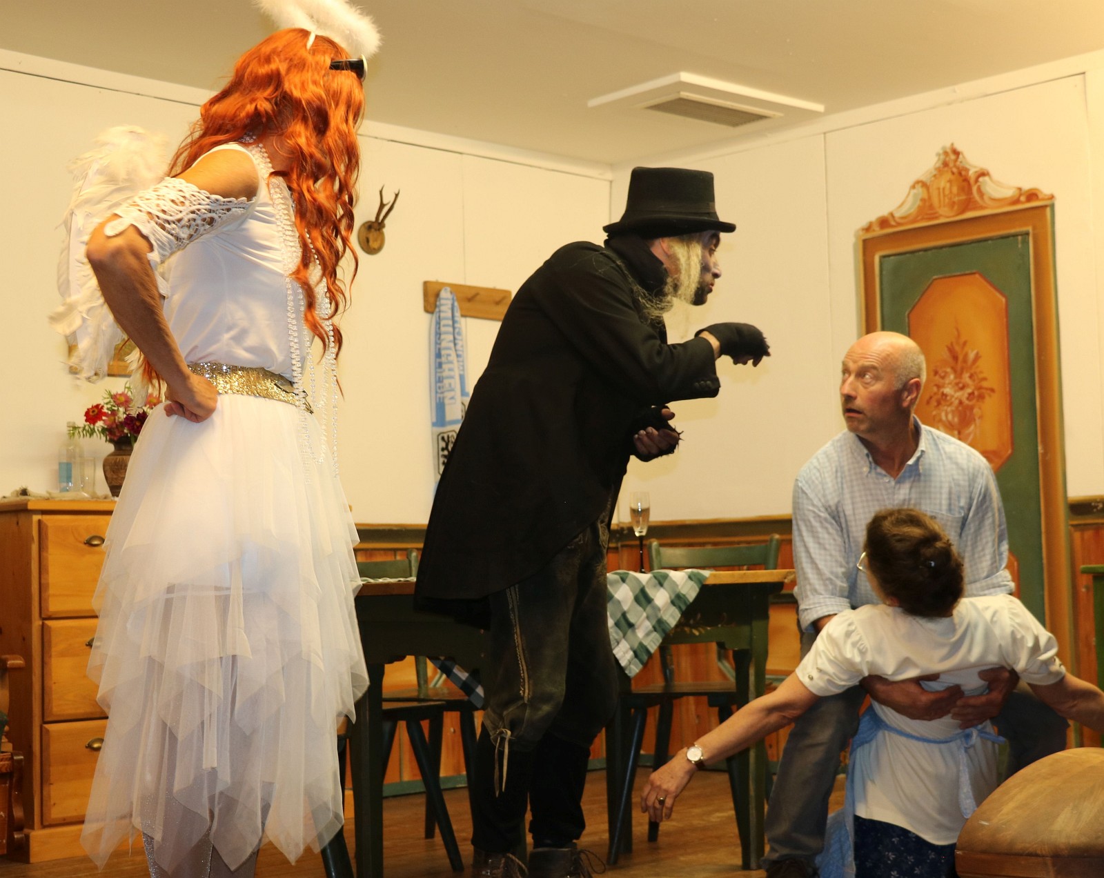 Erzengel Michaela (Christine Gau) und der Boandlkramer (Ludwig Freund) mit dem Ehepaar Sepp und Rosi Stemmer (Rita Stoib)