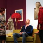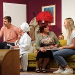 „Was unsere Väter alles gemeinsam haben“, stellten Vreni (Franziska Sichler) und Done (Anton Reiter) erstaunt gegenüber ihren Müttern fest. Dass sie über denselben Mann sprechen, wissen beide noch nicht, als sich der Vorhang das erste Mal hebt und die Theaterbesucher in zwei Haushalte blicken. Bei dem eingeweihten Publikum sorgte diese Feststellung für Schmunzeln, ahnte es doch schon das bevorstehende Chaos. Das Bühnenbild symbolisiert optisch getrennt die beiden Wohnungen; links der moderne Haushalt von Britt Schmidt (Anna-Maria Paar) mit ihrem 20-jährigen Sohn Done und rechts die im Landhausstil eingerichtete Wohnung von Maria Schmidt (Lisa Forstner) mit ihrer 18-jährigen Tochter Vreni. Wie vom Autor gefordert, sind in manchen Passagen beide Haushalte gleichzeitig auf der Bühne, ohne die Personen des anderen Haushaltes wahrzunehmen. Im Übrigen weist das Bühnenbild genügend Türen auf, um im rechten (oder auch unrechten) Moment Personen abgehen und auftreten zu lassen.