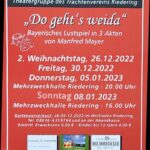 Die Theatergruppe des Trachtenvereins Riedering spielt an 4 Terminen im Dezember und Januar das bayerische Lustspiel “Do geht’s weida” von Manfred Mayer. Die Premiere findet am 2. Weihnachtsfeiertag, 26. Dezember 2022, um 20 Uhr in der Mehrzweckhalle Riedering statt. Die weiteren Termine lauten: