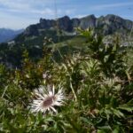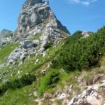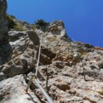 Abstieg: Vom Gipfelkreuz folgen wir in südwestlicher Richtung dem deutlich sichtbaren Weg und steigen auf diesem ab, einige Griffe erleichtern auf einer Länge von ca. 15 Metern den Abstieg über eine glatte Platte. Alternativ kann man auch über den neu eingerichteten Klettersteig (hier wieder Klettersteigausrüstung erforderlich) absteigen. Dieser beginnt etwas weiter vorn bei einem deutlich sichtbaren Drahtseil (Schwierigkeit: B). Kurze Zeit später vereinigen sich beide Wege wieder.
