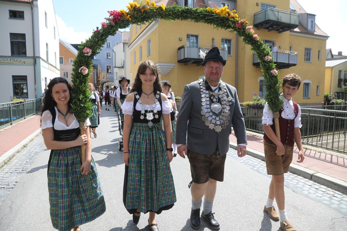 Strahlendes Königsschützenpaar unter dem blumengeschmücktem Bogen beim Dorfener Trachten- und Schützenumzug