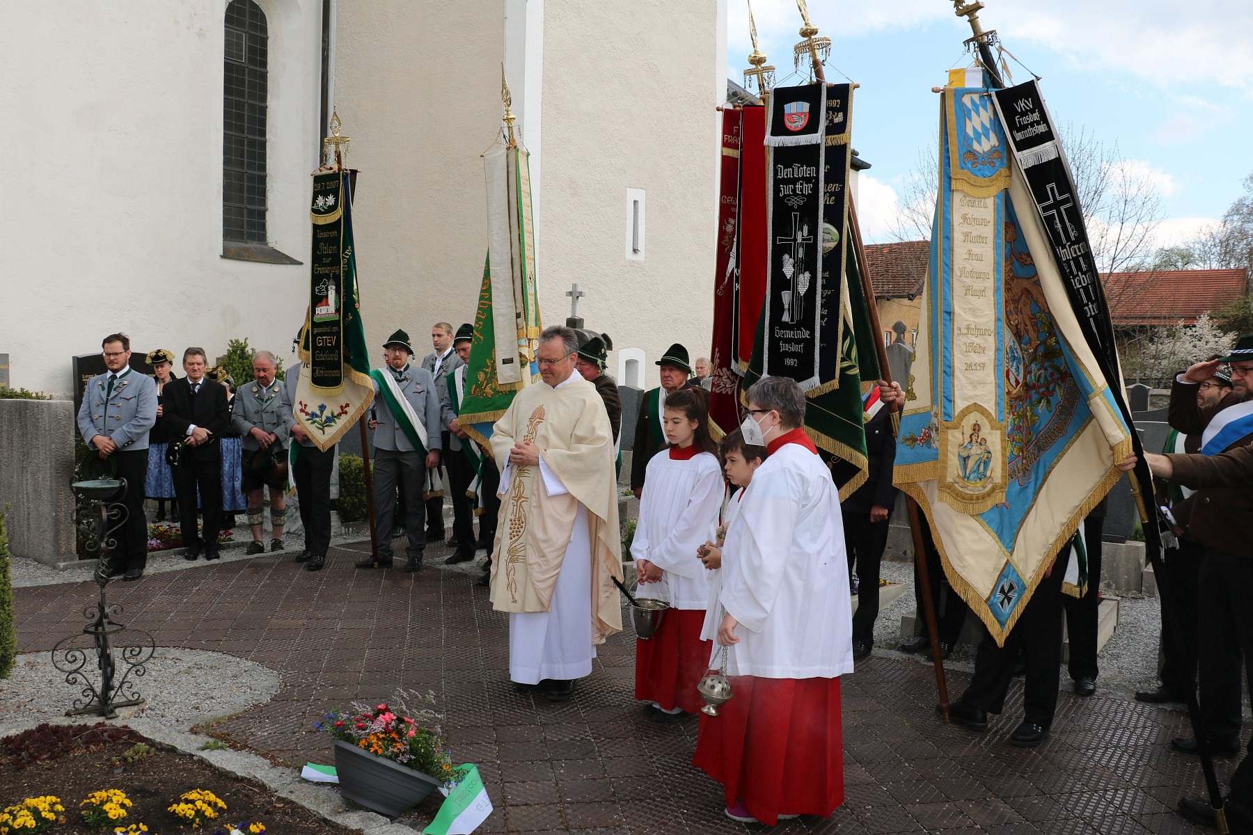 Pfarrer Paul Janßen und der Vorsitzende des Trachtenvereins „Lamstoana“ Frasdorf Sebastian Graf gedenken beim Jahrtag des Frasdorfer Trachtenvereins der verstorbenen und gefallenen Vereinsmitglieder am Kriegerdenkmal in Frasdorf