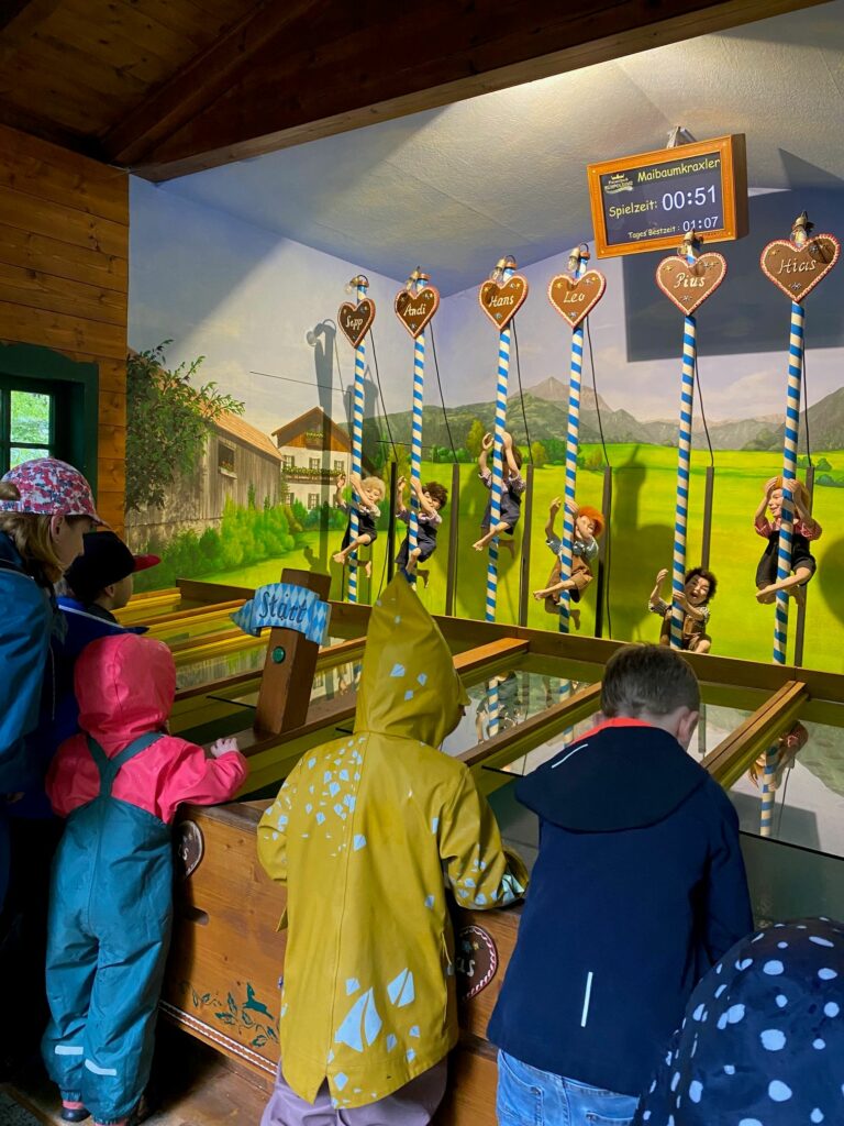 Bei der letztjährigen Adventfeier 2022 bekamen die Trachtenkinder als Weihnachtsgabe die Zusage für einen Sommer-Ausflug zum Märchenpark, Zeuge dafür war der Nikolaus höchstpersönlich! Endlich wurde ein Termin gefunden und Anfang August machten sich 25 Kinder und Jugendliche vom GTEV Simssee Süd Stephanskirchen voller Entdeckerdrang mit dem Bus auf zum Märchenpark nach Ruhpolding. Die Jugendleiter und einige Eltern begleiteten die heitere Schar durch den Park. Leider war den Stephanskirchner Ausflüglern der Wettergott diesmal nicht hold, es regnete fast den ganzen Tag. Nach dem Motto „Es gibt koa schlechtes Wetter, nur schlechte Kleidung“ waren alle Kinder regenfest ausgestattet. Den Kindern hatte der Regen gar nichts ausgemacht, zudem ist fast das ganze Gelände mit so vielen Baumen bewachsen, dass es nicht gar so sehr nass war. Insgesamt war der Park ob der Witterung ziemlich leer, die Kinder hatten keine Anstehzeiten und konnten nach Herzenslust die große Achterbahn so oft sie wollten, fahren. Weitere Highlights waren die Wasserrutsche, die Dirndldrahn-Wurfbude und das Maibaumkraxln. Nach einer entspannten Busfahrt ohne Stau kamen alle Kinder und Erwachsene wohlbehalten wieder am Vereinsheim an. „Schee war’s“