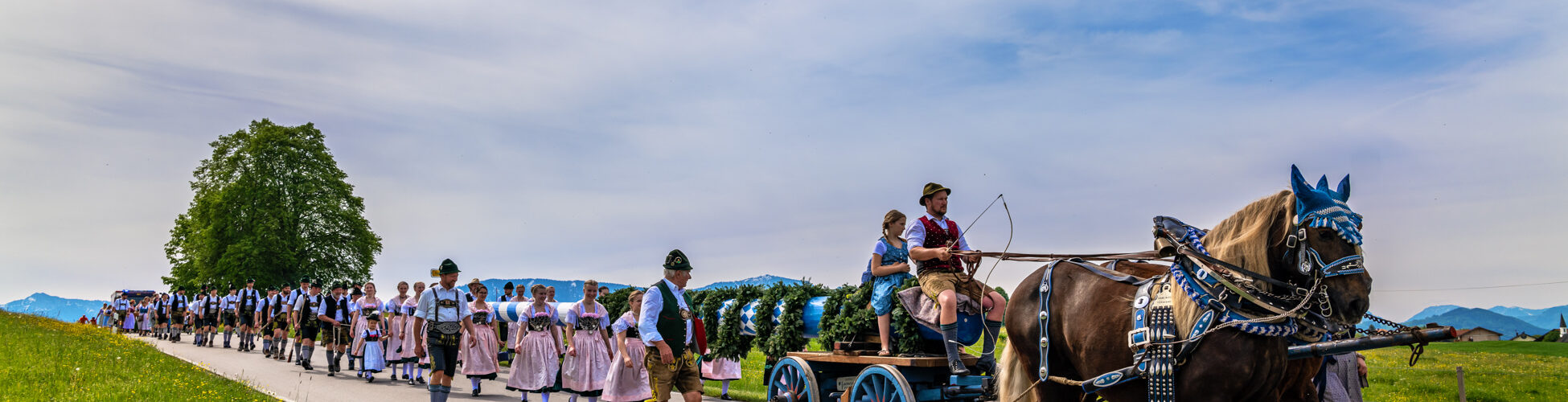 Heute am 1. Mai bringt der Trachtenverein Roßholzen den Maibaum nach Neukirchen am Simssee, gezogen von zwei Pferden, begleitet von in Tracht gekleideten Dirndl und Buben. In den frühen Morgenstunden des 1. Mai, als die ersten zarten Sonnenstrahlen über die idyllischen Hügel des Samerbergs krochen, begann eine jahrhundertealte Tradition zum Leben zu erwachen als sich die Mitglieder des Trachtenvereins Roßholzen versammelten, um den Maibaum nach Neukirchen am Simssee zu bringen.
