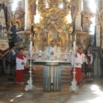 In der Wallfahrtskirche in Maria Thalheim wurde ein gemeinsamen und würdigen Rahmen Gottesdienst gefeiert. Diakon Christian Pastötter begrüßte eingangs die Trachtlerschar im schönen Wallfahrtsort Maria Thalheim im Erdinger Land “Schee das wieder da seits”. Pastötter gestaltete dann auch in der Wallfahrtskirche dieTrachtlerwallfahrtswortgottesdienstfeier und sagte, diese Tradition sei gut, „Aber sie muss immer wieder geprüft werden am Zentrum der Botschaft Christi“ und um die Rückbesinnung auf die Grundwerte. Grundwerte wie Zivilcourage, Vernunft, Aufrichtigkeit und Bekenntnis zum Glauben besinnen. Damit Werte und gute Traditionen erhalten werden können, muss es auch lebendige Zeugen dafür geben. Es braucht Gemeinschaften, die Traditionen in einem guten, lebensfördernden Sinne schützen und bewahren. Es braucht Gemeinschaften, die ihre Fahne und das Trachtengewand nicht in den Wind des Zeitgeistes hängen. Ein Trachtenverein ist der christliche Ursprung und weiß sich verpflichtet die Werte am Ort zu schützen, wie Glaube – Sitt – Tracht – Heimat. Und daher gilt es, die Heimat zu bewahren, darauf zu achten, dass in all den Veränderungen und Umbrüchen eines Dorfes das Heimatgefühl und die Verbundenheit untereinander nicht verloren gehen. Der Geistliche munterte die Trachtler in seiner Ansprache auf, an die Glaubenstreue festzuhalten, mit unserem täglichen Glauben“.