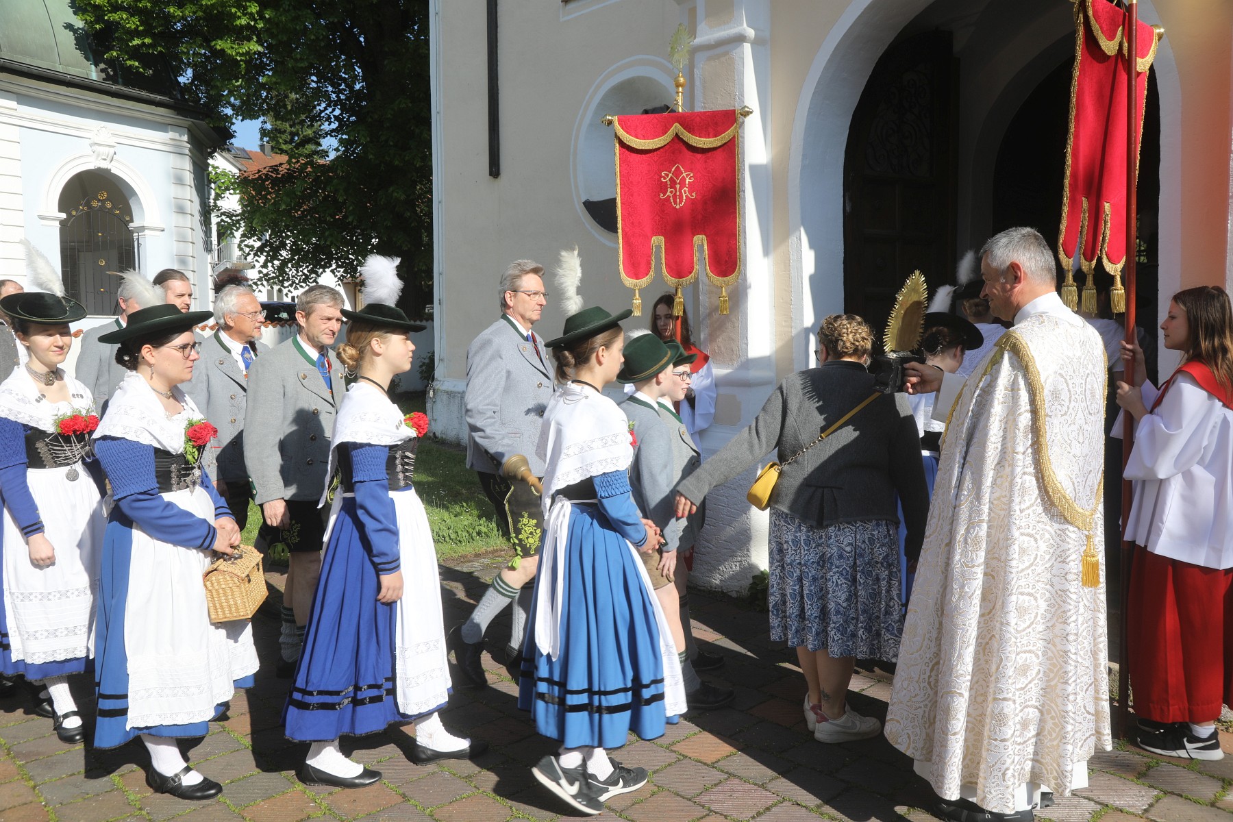 Die Ministranten zusammen mit dem Diakon Christian Pastötter empfingen am Ortsrand die pilgernde Trachtlerschar