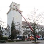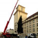 Gestiftet wurde in diesem Jahr der Baum von der Gemeinde Arrach im Lamer Winkel. Es ist ein 40 Jahre alter prächtiger Tannenbaum vom Feriendorf „Am Hohenbogen“ mit einer Länge von 18 Meter. Den Transport hat, wie schon in den Jahren zuvor, die Baustofffirma Max Schierer aus Cham kostenfrei übernommen. Am 1. Dezember 2017 traf der Schwertransport nach einer 6-einhalb-stündigen Fahrt gegen 8:00 Uhr morgens am Rathaus-Vorplatz ein. Geplant war die offizielle Übergabe des Christbaumes dann durch MdB Karl Holmeier, Bundestagsabgeordneter der Landkreise Cham und Schwandorf, an die Bezirksbürgermeisterin von Tempelhof-Schöneberg, Angelika Schöttler. Wegen kurzfristiger Terminprobleme konnten beide leider nicht anwesend sein. Somit erfolgte die Übergabe von den beiden Mitarbeitern der Schierer GmbH, Reinhard Speckner und Walter Wütz. Mit herzlichen Grüßen von MdB Karl Holmeier, dem Landrat und Bezirkstagspräsident Franz Löffler, dem Bürgermeister der Gemeinde Arrach, Sepp Schmid, dem Leiter der Touristinfo Arrach, Stephan Frisch, dem Gemeinderat Johannes Altmann, dem Chef des örtlichen Bauhofs Stefan Hutter, sowie dem Seniorchef der Firma Schierer, Max Schierer, übergaben sie, nach der routinemäßigen Aufstellung des Tannenbaumes, diesen an den Bezirksstadtrat Oliver Schworck und den Vertretern des Lichtenrader Volksparkvereins Wolfgang Spranger (1. Vorsitzender), Dieter Ganz und Manfred Könings. Herr Schworck bedankte sich im Namen der Bezirksbürgermeisterin recht herzlich für den 34. Christbaum aus dem Bayerischen Wald und wünscht sich diese Spendenaktion auch noch für viele weitere Jahre. Es ist der einzige von drei Weihnachtsbäumen im Bezirk Tempelhof-Schöneberg, der uns nichts kostet, so Herr Schworck.