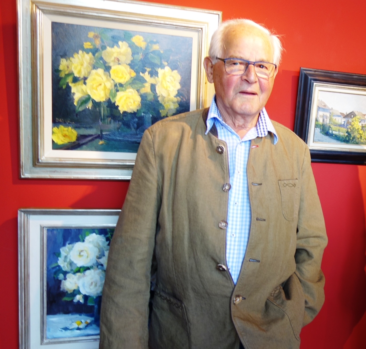 Georg Beyer vor zwei Jahren neben einigen seiner Gemälde.