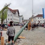In Prien am Chiemsee wird brauchtumsgemäß meist alle vier Jahre das Aufstellen des Maibaums zelebriert – am Sonntag, 1. Mai 2022 war es endlich wieder soweit. Statt weiß-blauem Himmel und Sonnenschein gab es bei der traditionellen Veranstaltung eine Wolkendecke und Regen. Doch davon ließ man sich in der Marktgemeinde nicht abschrecken und so begannen die Feierlichkeiten mit dem Mittagsläuten am Haus des Gastes in der Alte Rathausstraße 11. Dort feilschte der Erste Bürgermeister der Marktgemeinde Andreas Friedrich, für den das Maibaumaufstellen und die Verhandlungen eine Premiere waren, mit den „Maibaum-Räubern“ – den Mitgliedern der Jungbauernschaft Neukirchen am Simssee e.V. – um die Auslöse ihrer Diebesbeute. Anschließend erfolgte gemeinsam mit der Blaskapelle Prien, dem Trachtenverein GTEV Prien, der Jungbauernschaft Neukirchen und einem Rossgespann der feierliche Einzug auf den Priener Marktplatz. Aufgrund der Wetterbedingungen wurden die Männer, die nach alter Tradition mit langen Stangen (sogenannten „Schweiberln“) den rund 30 Meter hohen Baum aufrichten, von einem Kran unterstützt. Unter aufgestellten Schirmen und mitgebrachten Regenschirmen hatten zahlreiche Besucher:innen bei Getränken, Bier und bayerischen Schmankerln das Maibaumaufstellen gespannt verfolgt. In den Pausen zeigten die Kinder- und Jugendgruppen des Trachtenvereins ihr Können. Außerdem erfreute der Trachtenverein aus Herzogen-Aurach das Publikum mit einem Gastauftritt. Die Halter mit den Figuren werden in den kommenden Tag von Gemeindemitarbeitern mit der Feuerwehrdrehleiter angebracht. Diese Tradition hat ihren Ursprung im ausgehenden 18. Jahrhundert als viele Dörfer in Bayern ihre Abhängigkeit von Adel und Kirche abschüttelten und die bürgerliche Eigenständigkeit erlangten. Die Maibaumfiguren stellen hauptsächlich alte ortsansässige Handwerksberufe dar.