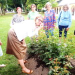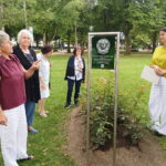 An die zweite Bürgermeisterin der Stadt Traunstein, Walburga Mörtl-Körner (links vom Schild) übergaben die Präsidentin des Soroptimist Club Traunstein, Martha Selbertinger (rechts) und einige Mitglieder des Clubs symbolisch ein Beet mit Rosenstöcken im Stadtpark als Geschenk zum 650. Stadtjubiläum.