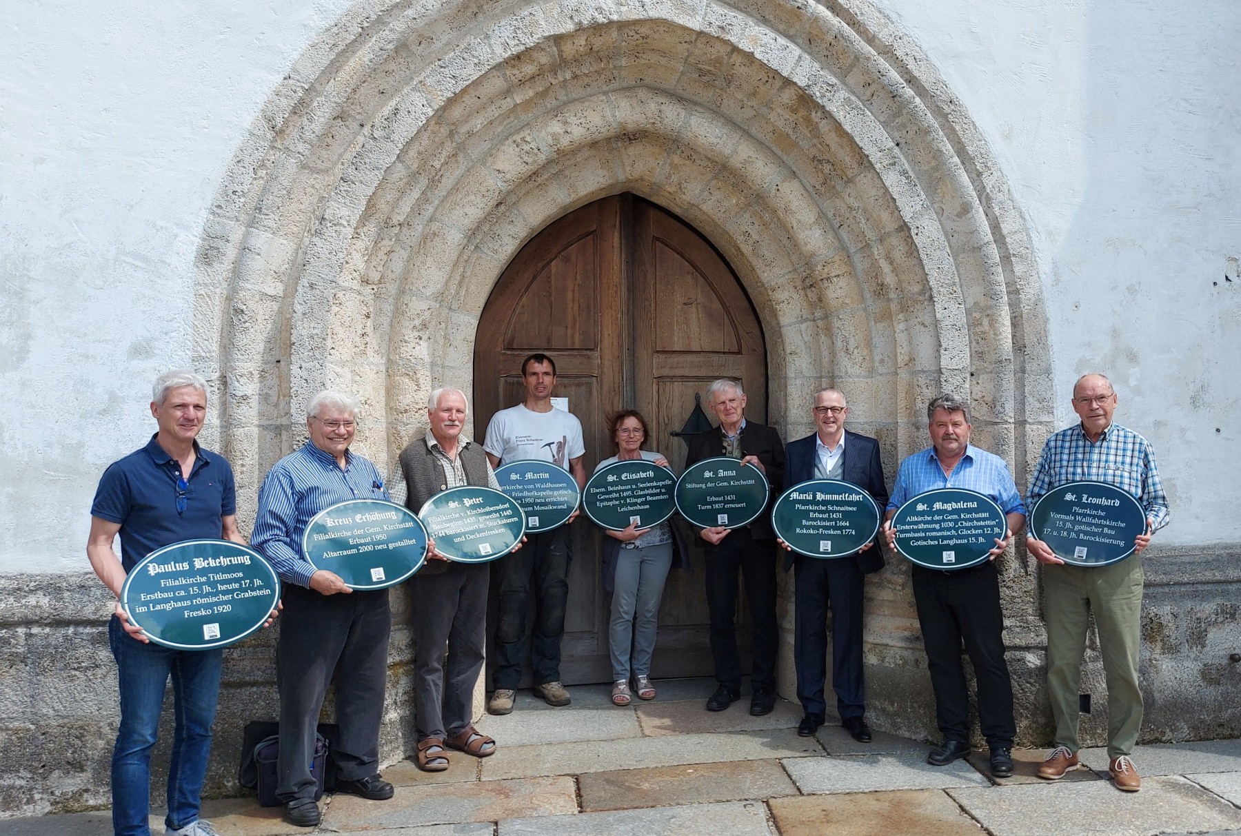 Die Kirchentafeln für die zwölf Kirchen im Pfarrverband Schnaitsee präsentierten Bürgermeister Thomas Schmidinger (von links), Richard Hellmeier (Heimatverein), die drei Kirchenpfleger Peter Gäßl (St. Leonhard), Franz Schachner (Waldhausen), Elisabeth Heiß (Schnaitsee), Dr. Arnold Böhm (Heimatverein) Pfarrer Mario Friedl, Sepp Reithmeier (LAG Chiemgauer-Seenplatte) und Ortsheimatpfleger Reinhold Schubeck. Foto: LAG Chiemgauer-Seenplatte