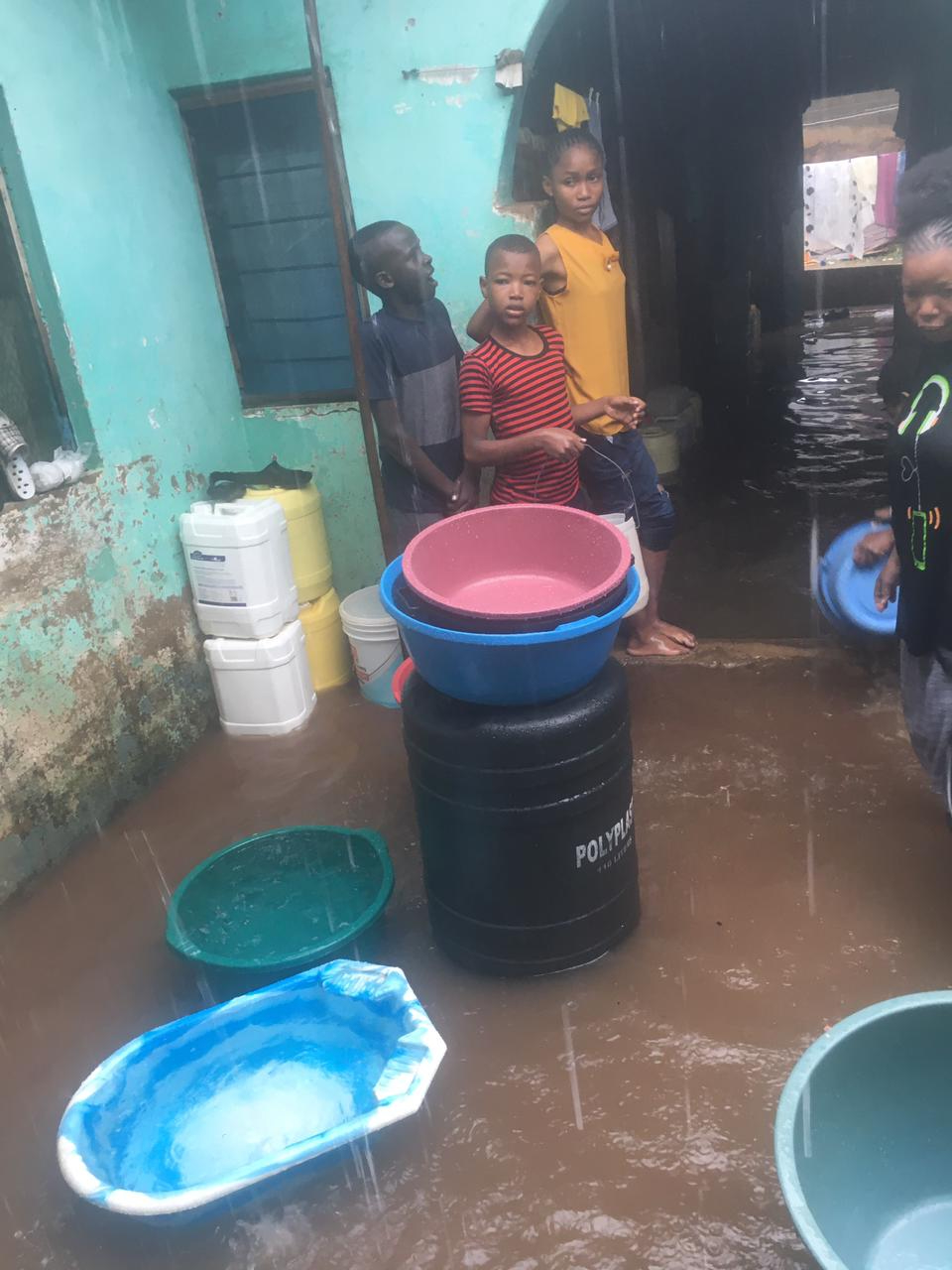 Fassungslos stehen die Kinder im Wasser, während ihre Eltern verzweifelt versuchen, sich von den Wassermassen in ihren Unterkünften zu befreien.