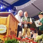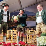 Strauch stellte kurz das Dorf vor, in dessen Vereinen sich Tradition und Weltoffenheit spiegle, besonders auch in dem heuer seit 50 Jahren bestehenden Musikverein Übersee-Feldwies. Er dankte besonders den Organisatoren des Festes und den unzähligen ehrenamtlichen Helfern sowie großzügigen Sponsoren, ohne die das Fest nie zustande gekommen wäre. Der Bezirksvorsitzende des MON Thomas Egger, überreichte symbolisch ein kleines Schnapsfassl zum Dank für die in Übersee geleistete Arbeit an den ersten Vorstand des Musikvereins Christian Kroner und den zweiten Vorstand und Festleiter Markus Genghammer (Foto).