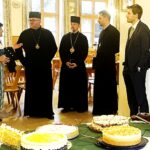 - Am Kuchbüffet von links: Kathi Schmid – Bischof Firman – Erzbischof Martinyuk, Pfarrer Vynnyk und Bürgermeister Simon Hausstetter.